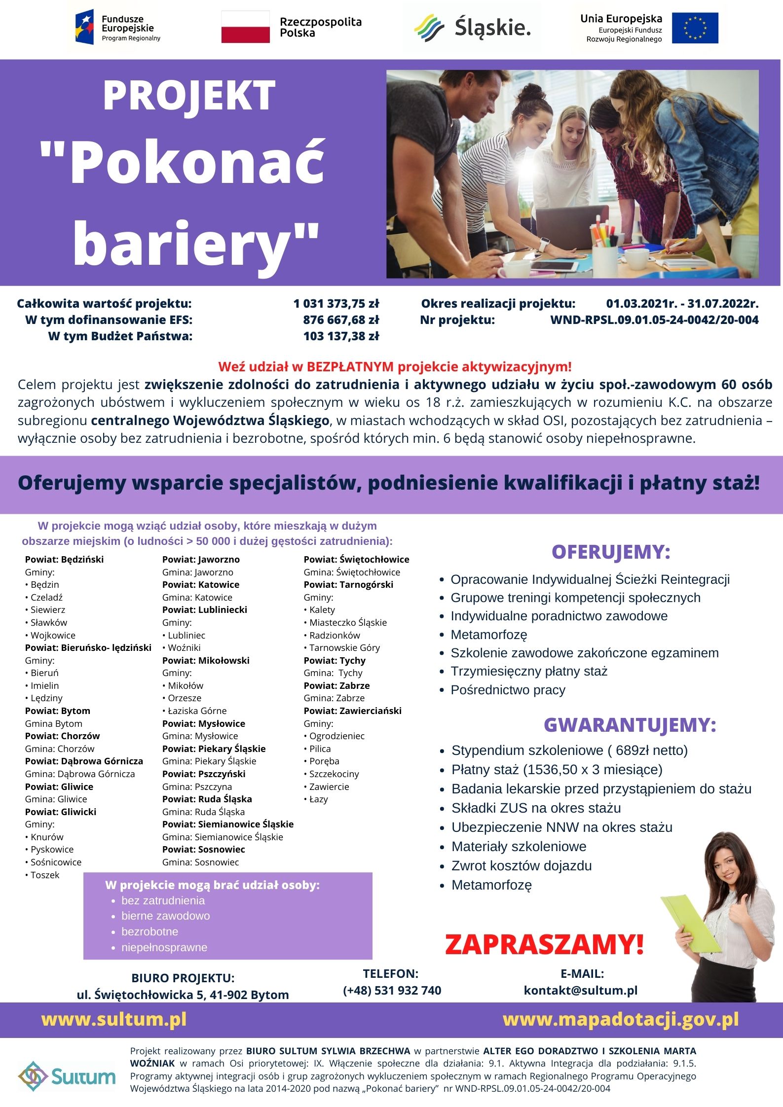 Projekt realizowany przez BIURO SULTUM SYLWIA BRZECHWA w partnerstwie ALTER EGO DORADZTWO I SZKOLENIA MARTA WOŹNIAK w ramach Osi priorytetowej: IX. Włączenie społeczne dla działania: 9.1. Aktywna Integracja dla poddziałania: 9.1.5. Programy aktywnej integracji osób i grup zagrożonych wykluczeniem społecznym w ramach Regionalnego Programu Operacyjnego Województwa Śląskiego na lata 2014-2020 pod nazwą „Pokonać bariery" nr WND-RPSL.09.01.05-24-0042/20-004