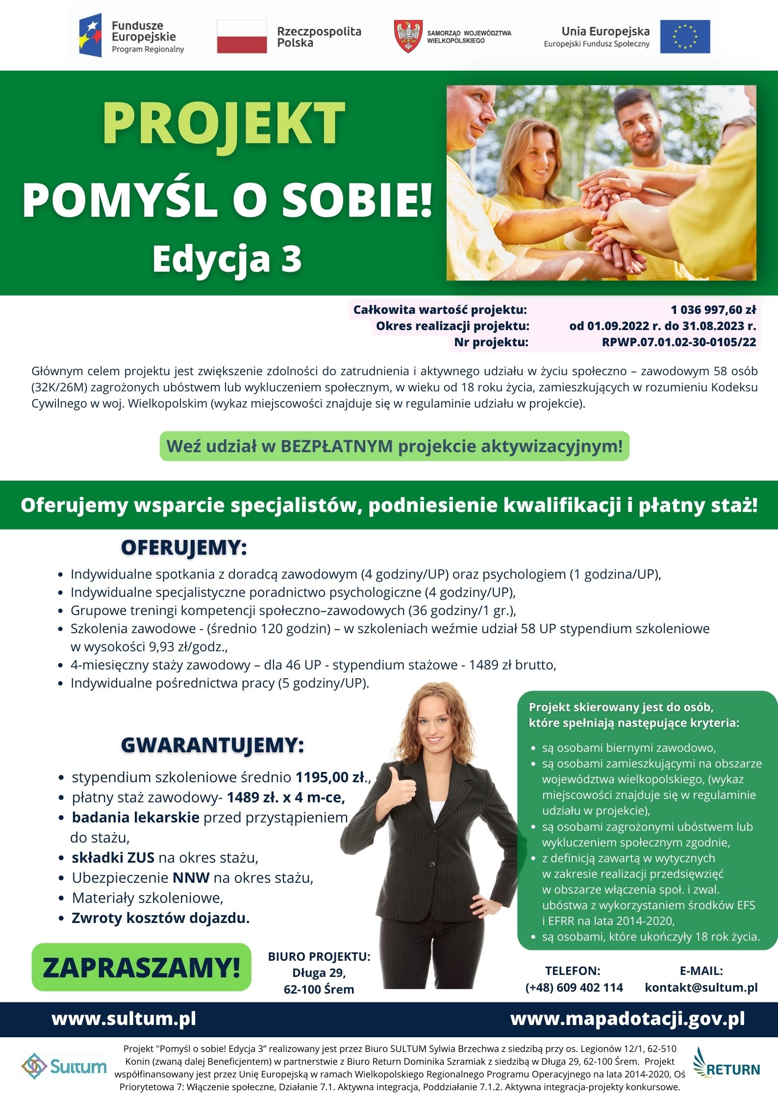Projekt "Pomyśl o sobie! Edycja 3" realizowany jest przez Biuro SULTUM Sylwia Brzechwa z siedzibą przy os. Legionów 12/1, 62-510 Konin (zwaną dalej Beneficjentem) w partnerstwie z Biuro Return Dominika Szramiak z siedzibą w Długa 29, 62-100 Śrem. Projekt współfinansowany jest przez Unię Europejską w ramach Wielkopolskiego Programu Operacyjnego na lata 2014-2020, Oś Priorytetowa 7: Włączenie społeczne, Działanie 7.1. Aktywna integracja, Poddziałanie 7.1.2. Aktywna integracja-projekty konkursowe.